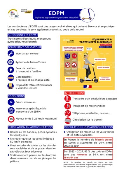 En 2025, trop d’usagers ont perdu la vie sur les routes du département. Une situation préoccupante où les usagers d’EDPM (Trottinettes électriques, draisiennes, hoverboards) sont de plus en plus concernés, avec un taux d’accidentalité en hausse. C’est pourquoi, pour la sécurité de tous et limiter ces accidents, les EDPM sont également soumis au code de la route.