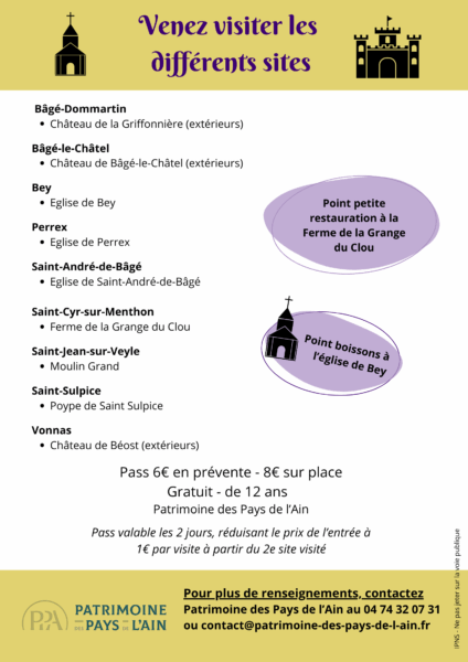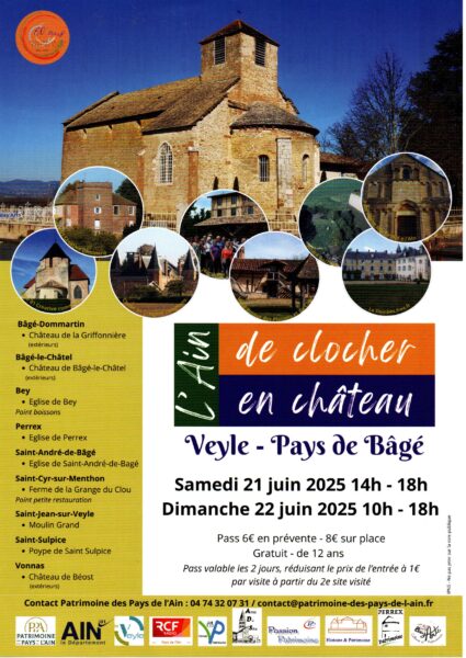 La Fédération Patrimoine des Pays de l’Ain vous donne rendez-vous le 21 juin, de 14h à 18h, et le 22 juin, de 10h à 18h pour les visites des monuments des territoires de la Communauté de communes de la Veyle et Bresse et Saône : « L’Ain, de clocher en château ».