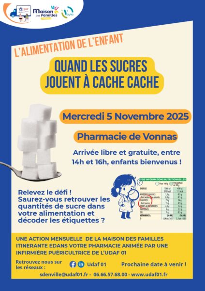 Ce mercredi 5 novembre, l’Union Des Associations Familiales revient avec un nouvel atelier : « Quand les sucres jouent à cache-cache ».
