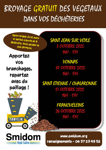 Le SMIDOM vous donne rendez-vous à la déchèterie de Vonnas, ce vendredi 10 octobre, de 14h00 à 17h00, pour broyer vos végétaux gratuitement.