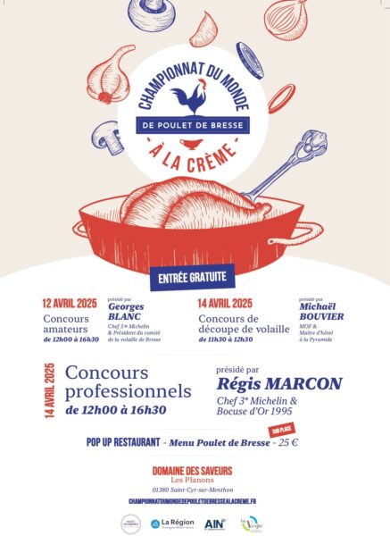Ce samedi 12 avril et lundi 14 avril prochain se déroule le championnat du monde du poulet de Bresse à la crème au Domaine des Saveurs – Les Planons, à Saint-Cyr-sur-Menthon.