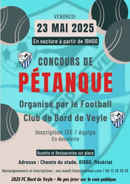 Le FCBV vous attend nombreuses et nombreux le vendredi 23 mai, à partir de 19h00, pour un concours de pétanque.