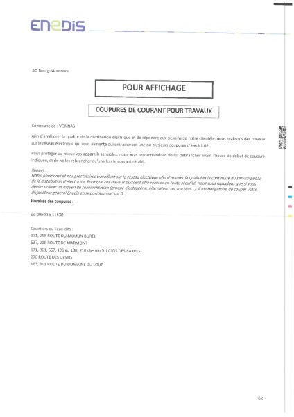 Afin d’améliorer la qualité de la distribution électrique et répondre aux besoins de la clientèle, la société Enedis réalisera des travaux sur le réseau électrique. Ces travaux entraîneront une coupure électrique le jeudi 23 avril 2026, entre 9h00 et 11h30.