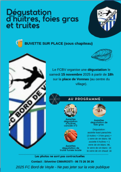 Le FCBV vous invite à sa dégustation d’huîtres, de foies gras et de truites, le samedi 15 novembre, à partir de 18h00, sur la place Ferdinand de Béost.