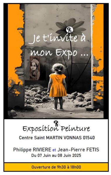 Philippe Rivière et Jean-Pierre Fetis vous attendent nombreuses et nombreux lors de leur exposition de peinture, ce week-end 7 et 8 juin, de 9h30 à 18h00, en centre Saint-Martin de Vonnas.