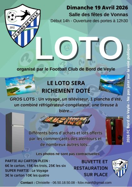 Le FCBV vous donne rendez-vous le dimanche 19 avril 2026, à la salle des fêtes de Vonnas, pour son traditionnel loto !