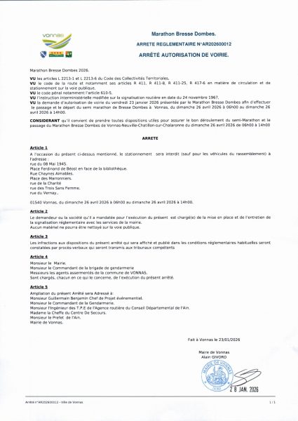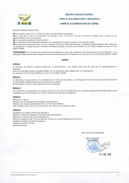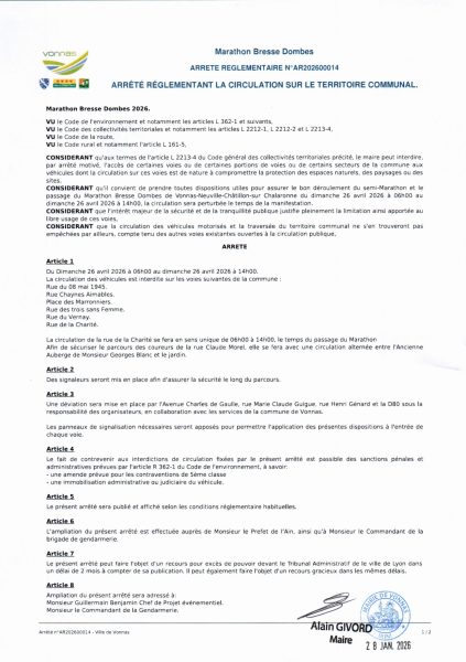 Afin de sécuriser le parcours des coureurs, la circulation se fera de façon alternée entre l’Ancienne Auberge Georges Blanc et le jardin. Une déviation sera mise en place par l’Avenue Charles de Gaulle, rue Marie Claude Guigue, rue Henri Génard et la D80.