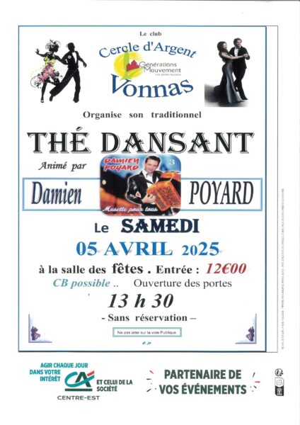 Le Cercle d’Argent vous donne rendez-vous le 5 avril, à partir de 13h30, à la salle des fêtes pour son traditionnel thé dansant, animé par Damien POYARD.
