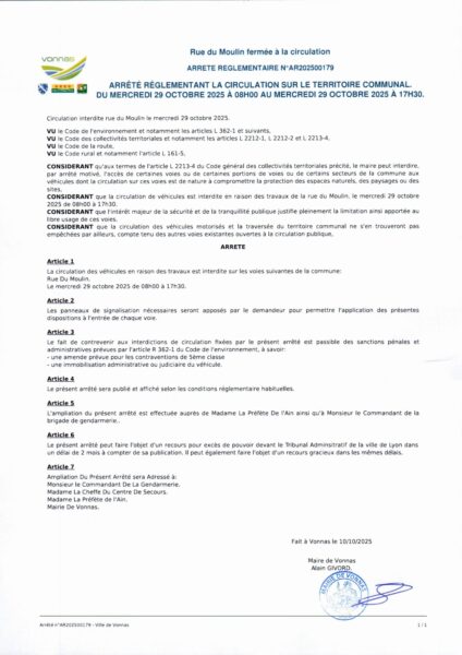 La circulation sera également interdite rue du Moulin toute la journée du mercredi 29 octobre.
