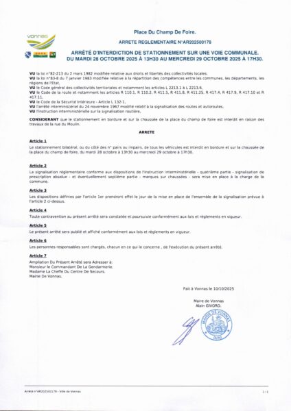 Afin d’assurer le bon déroulement de l’installation, le stationnement sera interdit du mardi 28 octobre à partir de 13h30 au mercredi 29 octobre à 17h30, sur la place du champ de foire.