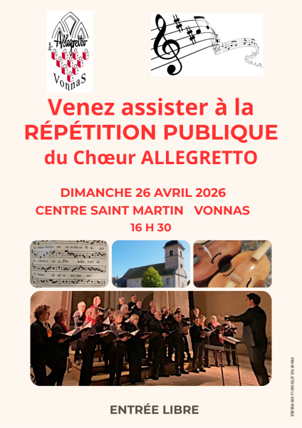 Le Chœur Allegretto de Vonnas vous invite à venir assister à une répétition publique et gratuite le dimanche 26 avril, à 16h30, au centre Saint-Martin.