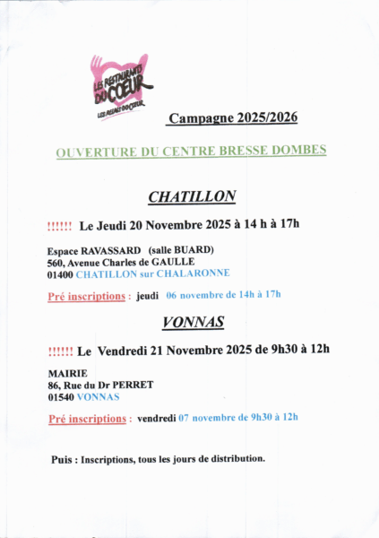 Le centre de distribution de Châtillon-sur-Chalaronne sera quant à lui ouvert le jeudi 20 novembre, de 14h00 à 17h00, à l’espace Ravassard (salle Buard). Les pré-inscriptions se feront le jeudi 6 novembre, de 14h00 à 17h00.