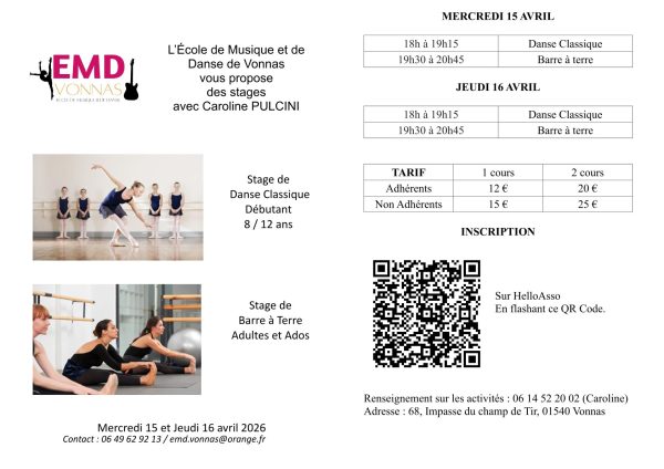 L’École de Musique et de Danse vous propose des stages de danse classique (8/12 ans) et de barre à terre (adultes/ados) avec Caroline Pulcini, le mercredi 15 et le jeudi 16 avril, de 18h00 à 19h15 et de 19h30 à 20h45.
