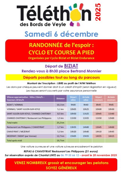 - Randonnée cyclo et course à pied : départ à 8h30 de Biziat ou à 13h30 de Chaveyriat