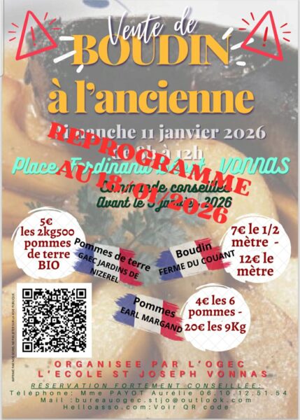 Réservez au plus vite avant le 12 janvier par téléphone : 06 10 12 51 54, par mail : bureauogec.stjo@outlook.com ou sur https://www.helloasso.com/associations/ogec-ecole-st-joseph-vonnas/evenements/vente-de-boudin-a-l-ancienne-2026