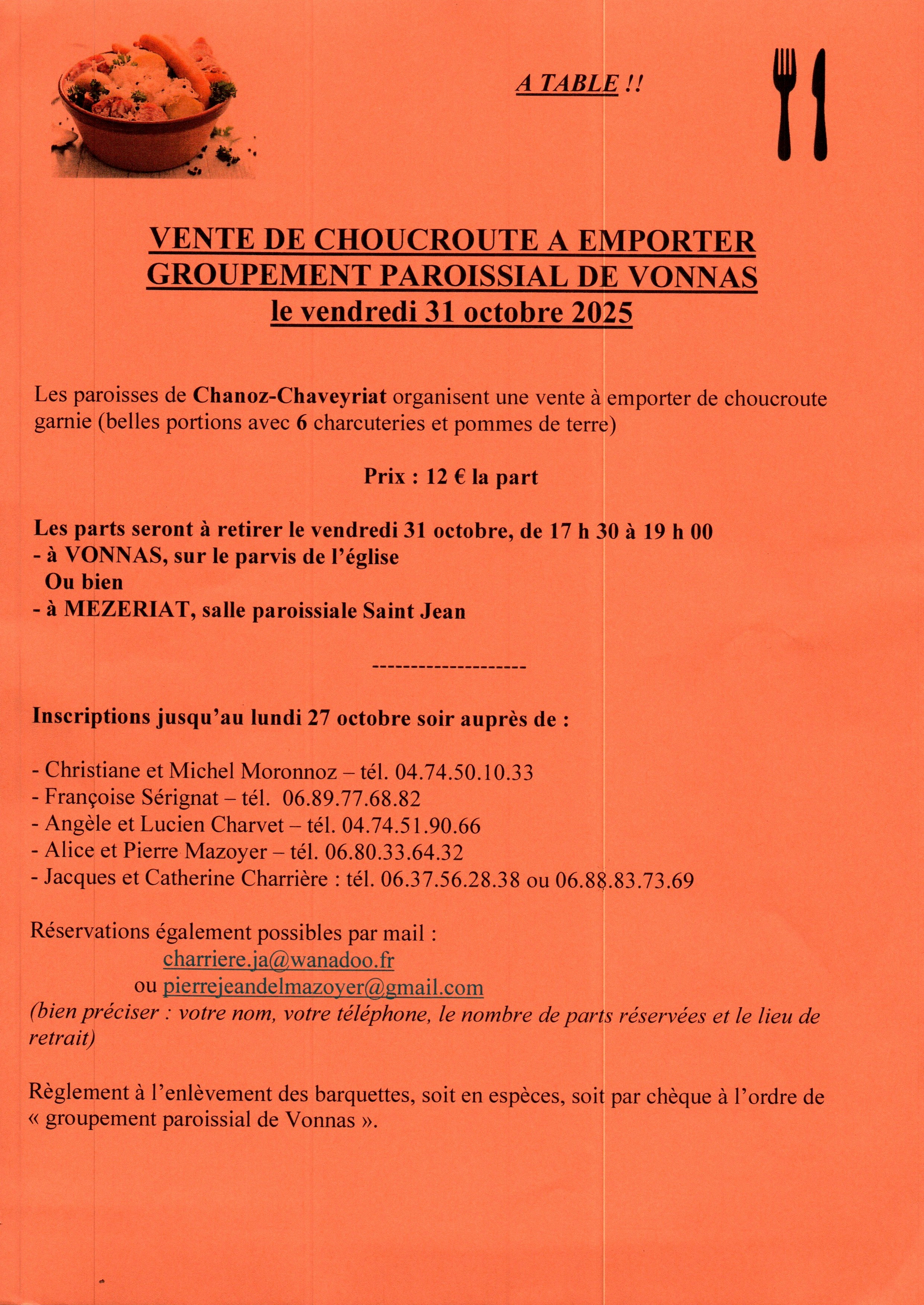 Le Groupement Paroissial de Vonnas organise une vente de choucroute le vendredi 31 octobre, de 17h30 à 19h00, sur le parvis de l’église à Vonnas ou à la salle paroissiale Saint-Jean, à Mézériat.