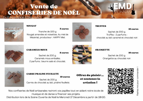 Si vous souhaitez profiter de ces gourmandises et soutenir l’association, vous avez jusqu’au samedi 6 décembre pour commander via ce lien : https://www.helloasso.com/associations/ecole-de-musique-et-de-danse-de-vonnas/boutiques/vente-confiseries-pour-noel-2025/widget-vignette